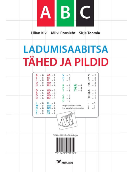 Suure ladumisaabitsa õpilase variant. Pildid on must-valged, et õpilane saaks neid sõna õige ladumise korral värvida.