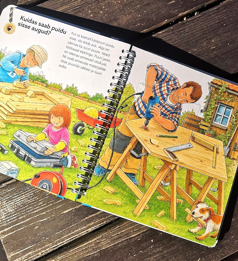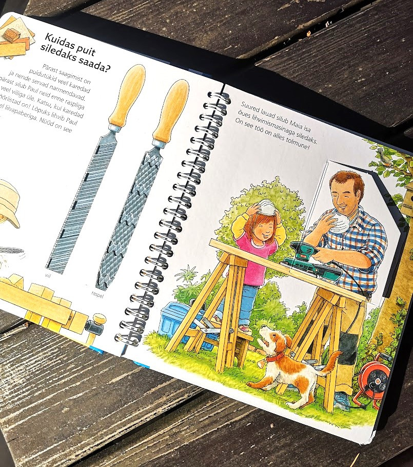 Seekord hakkavad lapsed koos isaga mängumaja ehitama. Vaja läheb mitmeid tööriistu. Puidutöötoas on need kõik olemas. Mõnda tohib kasutada ainult isa, aga vahel saavad ka lapsed kaasa lüüa. Isegi koer Reks püüab abiks olla ja tassib tööriistu hambus. Viimaks värvitakse maja üle ja mäng võib alata.