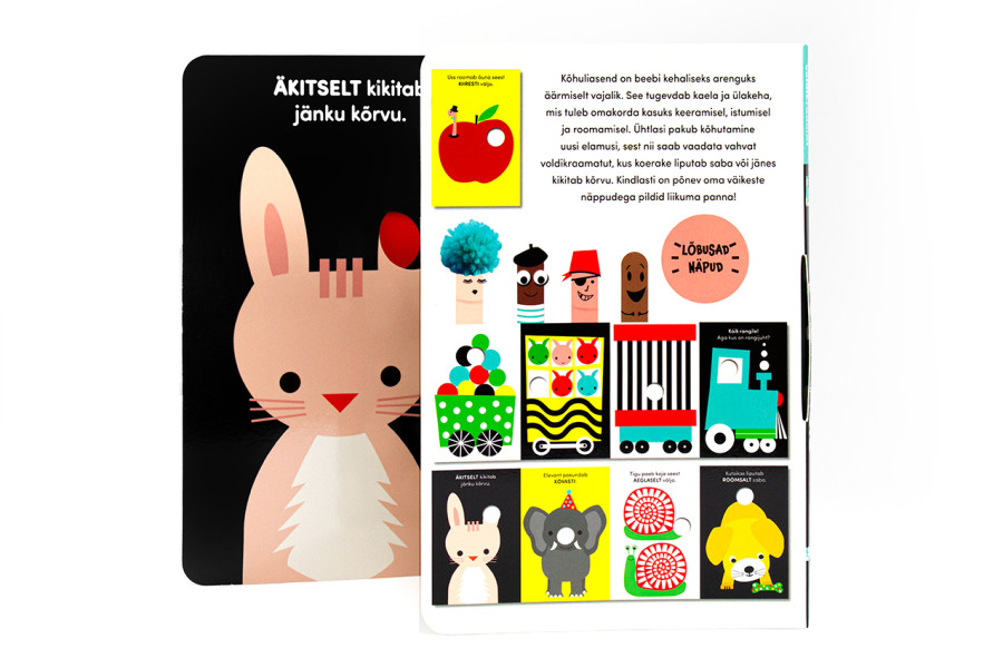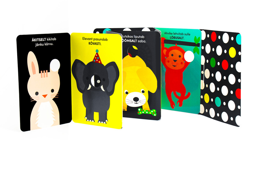 Kontrastsete värvidega voldikraamatut saab vaadata ja uurida kõhuliasendis. Kõhuliasend on beebi kehaliseks arenguks äärmiselt vajalik. See tugevdab kaela ja ülakeha, mis tuleb omakorda kasuks keeramisel, istumisel ja roomamisel. Ühtlasi pakub kõhutamine uusi elamusi, sest nii saab vaadata vahvat voldikraamatut, kus koerake liputab saba või jäneskikitab kõrvu. Kindlasti on põnev oma väikeste näppudega pildid liikuma panna!