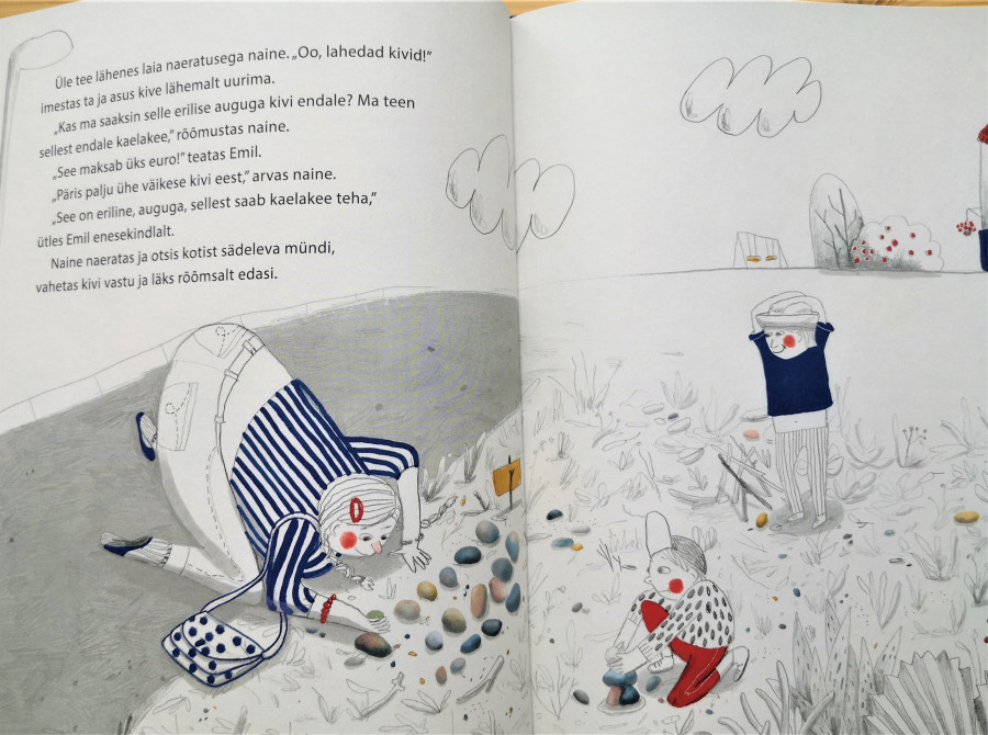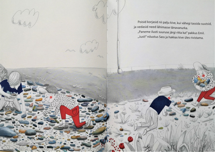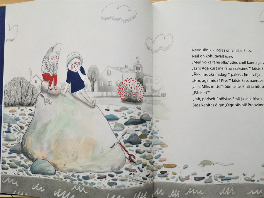 Emil ja Sass istuvad kivi otsas ja igavlevad. Teeks midagi, aga mida? Ja raha ka pole. Emil haarab Sassi pooleldi naljaga õhku visatud mõttest kinni ja poisid otsustavad hakata müüma – kive. Idee, mis esiotsa tundub peaaegu hullumeelne, hakkab samm-sammult ja olusid arvestades arenema vägagi mõistlikuks ettevõtmiseks. „Emil, Sass ja kivimutukad“ on vahva ja siiras raamat, mis oma sõnumi poolest sobiks ettevõtluse käsiraamatuks algajale, vormi poolest järgib aga igati vanu häid lastejutu traditsioone. Autor Tiiu Kitsik on eesti lastekirjanduses juba tuntud nii kirjaniku kui ka illustraatorina. Koolibri kirjastamisel on tema loomingut ilmunud õige mitmes raamatus, viimati tekstiautorina Pamela Sameli pildiraamatus „Kes seal on?“ (2022).