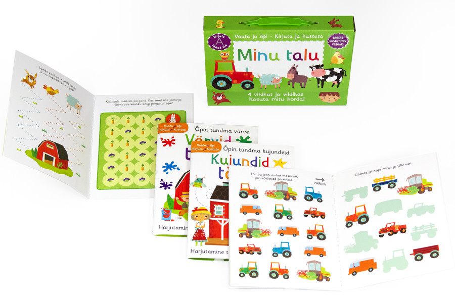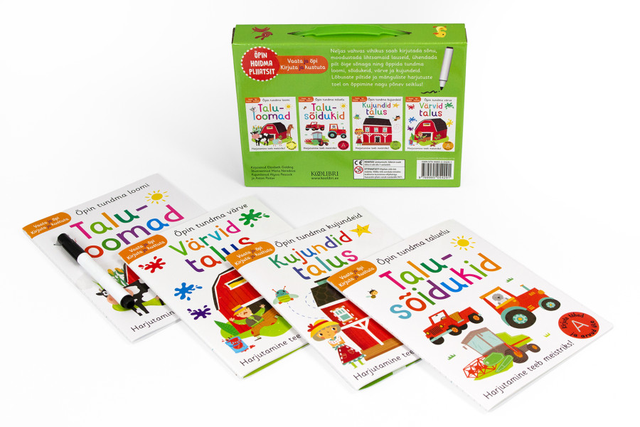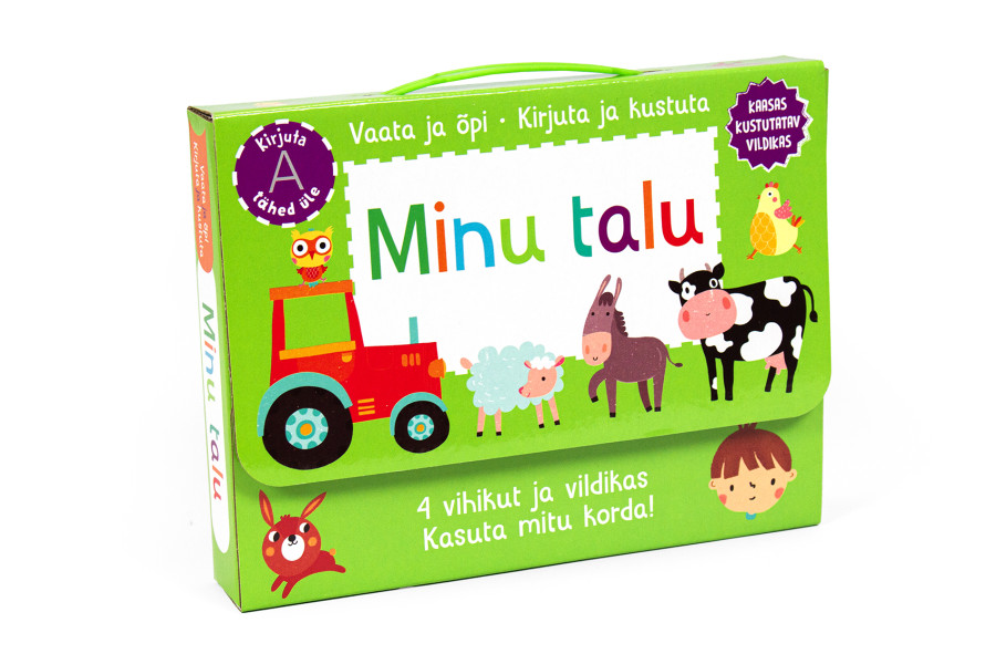 Toredas kohvris on 4 tegelusvihikut ja kustutatav vildikas. Vihikutes saab kirjutada sõnu, moodustada lihtsamaid lauseid, ühendada pilt õige sõnaga ning õppida tundma loomi, sõidukeid, värve ja kujundeid.