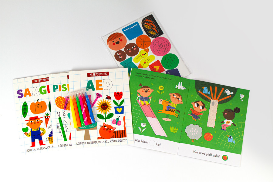 Neli erksavärvilist kleepsuvihikut ärgitavad lapsi leidma sobiva kujuga kleepse, millega pildid lõpuni teha. Õige kujuga tüki leidmine arendab paaride leidmise, kujundite tundmise, visuaalse mõtlemise ja peenmotoorika oskusi. Igal pildil on ka alasid, mida laps saab ise värvida.