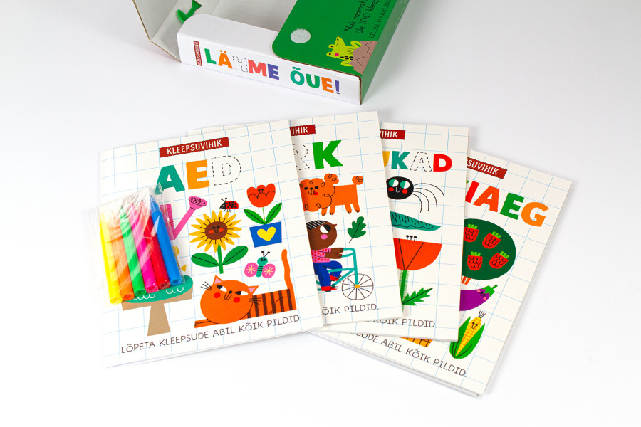 Komplektis neli vihikut ja vildikad. Vihikute pealkirjad on "Park", "Aed, "Pisielukad" ja "Saagiaeg".