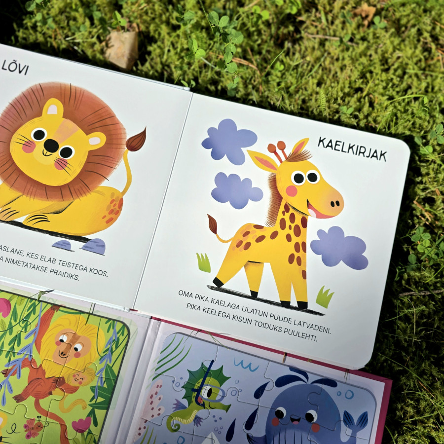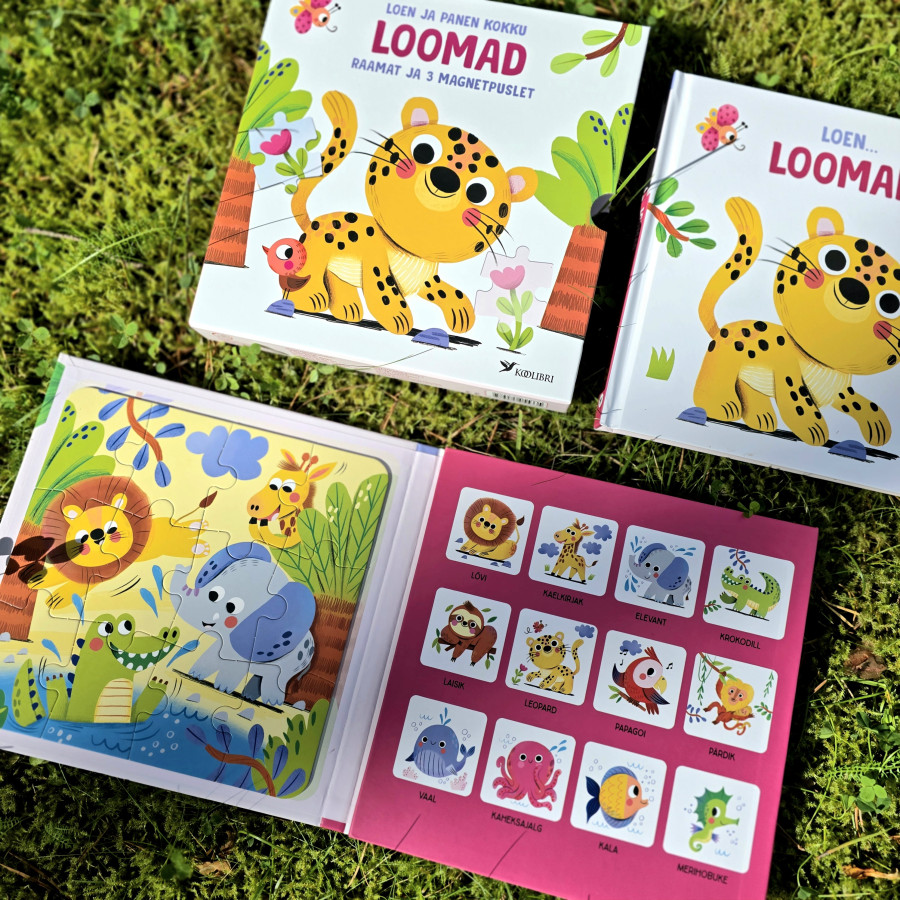 Kaks ühes – õppimine ja mäng! Karbis on pildiraamat ja kolm magnetalusele kinnituvat puslet. Raamat tutvustab maal, puu otsas ja vees elavaid loomi. Suurtähtedes kiri aitab kokku veerida loomade nimesid ja toredaid fakte nende kohta. Puhkuseks saab aga kokku panna puslepilte, mille tegelasteks on raamatus kohatud loomad. 12, 16 ja 20 tükist koosnevad pusled kinnituvad igaüks oma alusele, nii ei lähe pusletükid kaotsi.
