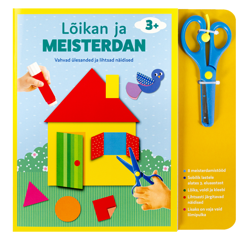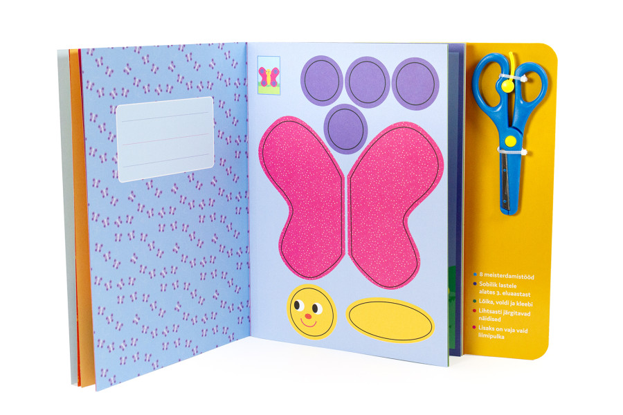 Kaunis meisterdamisraamatus õpib laps lõikama, voltima ja liimima. Käelised harjutused sobivad väikelastele ja näidiste järgi on lihtne tegutseda. Meisterdamiseks vajalikud käärid ja paberid on raamatus olemas, juurde on vaja vaid natuke liimi.