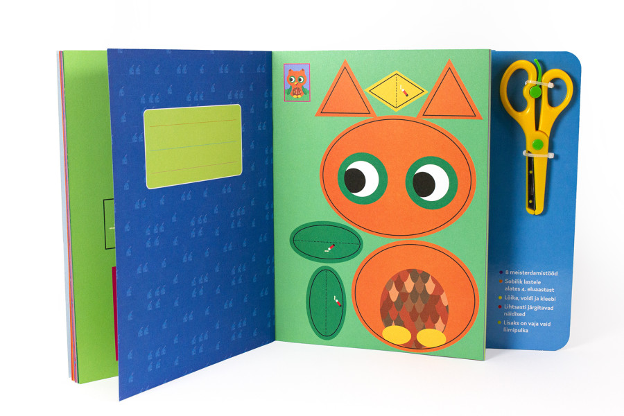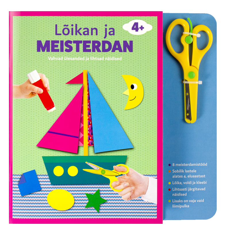 Kaunis meisterdamisraamatus õpib laps lõikama, voltima ja liimima. Käelised harjutused sobivad väikelastele ja näidiste järgi on lihtne tegutseda. Meisterdamiseks vajalikud käärid ja paberid on raamatus olemas, juurde on vaja vaid natuke liimi.