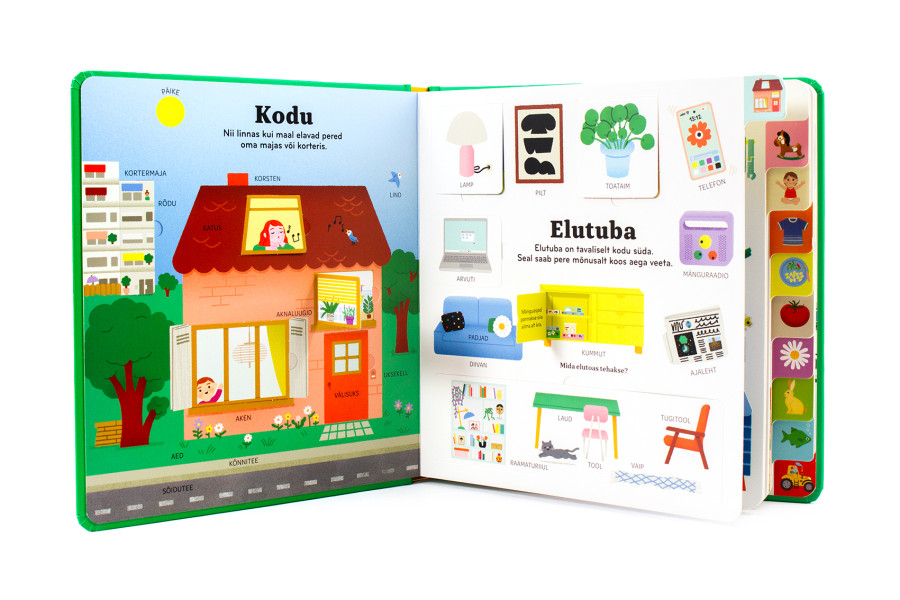Värvikirevad pildid juhivad meid läbi erinevate teemade. Nii saab laps õppida uusi sõnu ja mõisteid. Raamat arendab sõnavara ja mõtlemist, annab võimaluse rääkida lapsega tema päevast ja tegevustest – kõigest, mida ta enda ümber näeb. Klappide alt leiab lisaks põnevaid detaile. Küljel olevad värvilised sakid aitavad õige teema hõlpsasti üles otsida.