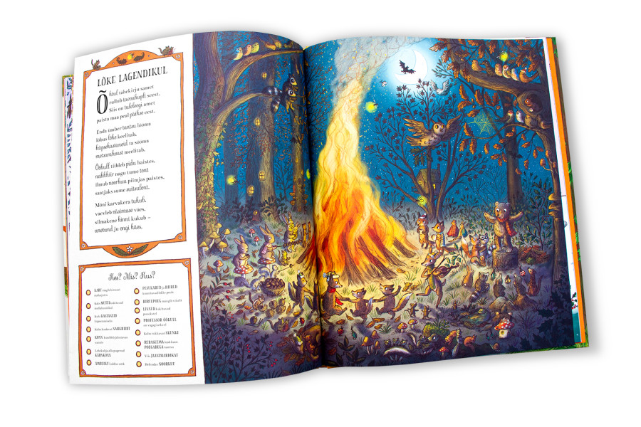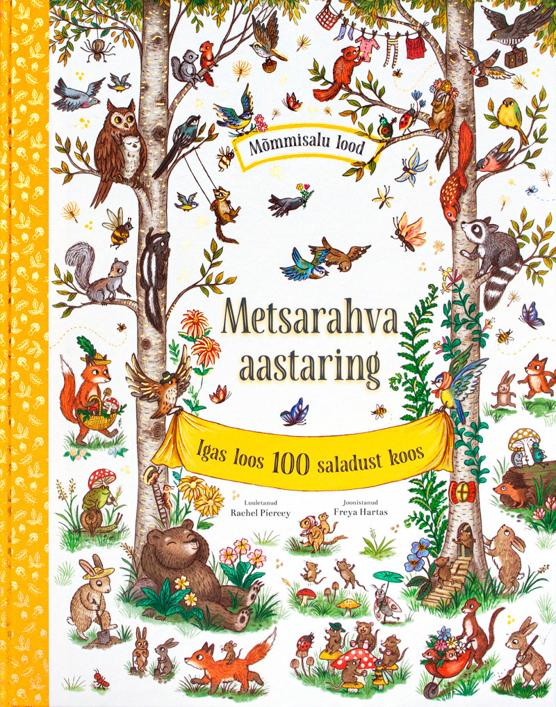 Põnevust jätkub raamatu igale lehepaarile: mis saladusi ja lugusid peidab mets? Suurelt pildilt tuleb lapsel üles leida rubriigis „Kes? Mis? Kus?“ nimetatud detail või väike stseen, milles osaleb keegi metsarahva seast. Iga pildi juures on luuletus, mille teemaks on valitud mõni lapse elus oluline sündmus või tegevus, näiteks sünnipäev, koolitund või -mäng, piknik, onniehitus, lõkketegemine jms. Raamat on üles ehitatud aastaringile, iga aastaaja kohta on neli lehepaari. Peale selle jagab raamatu lõpus huvitavat infot „Loodusrada“.