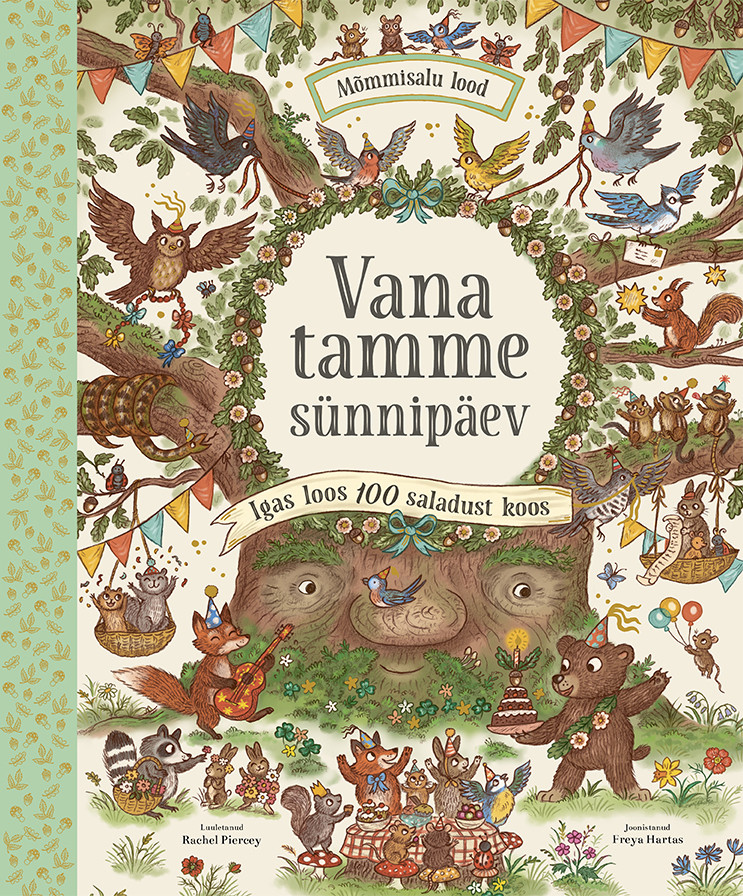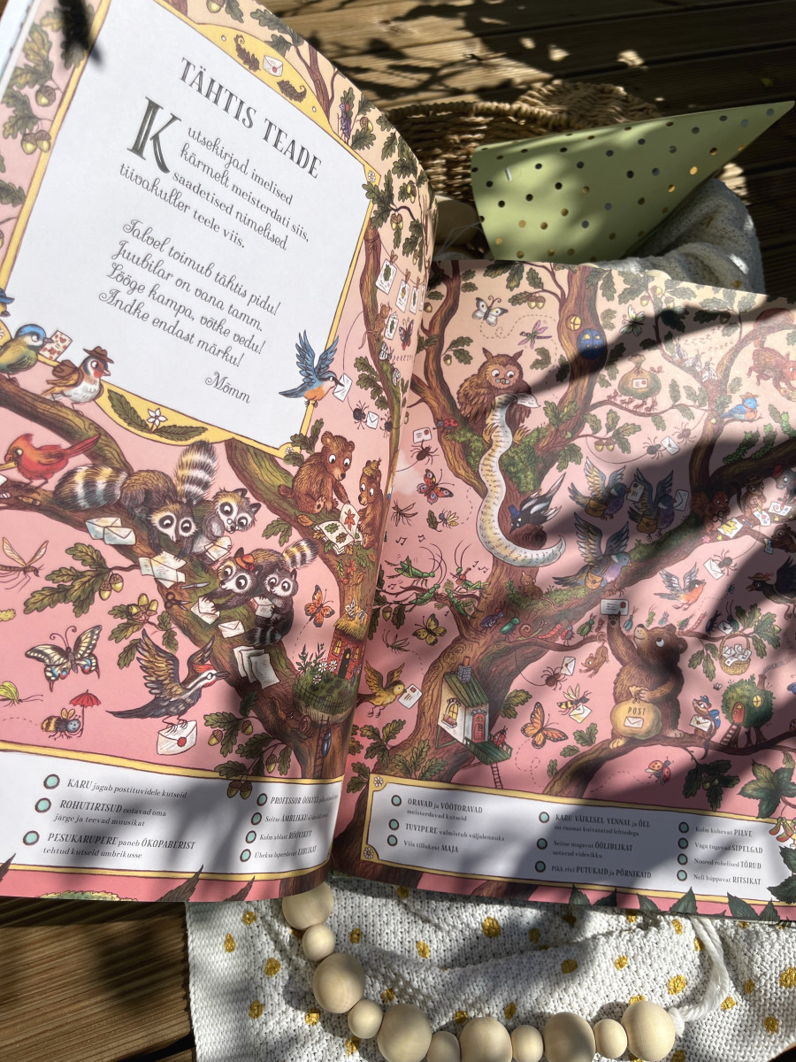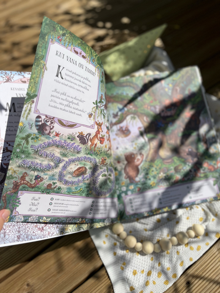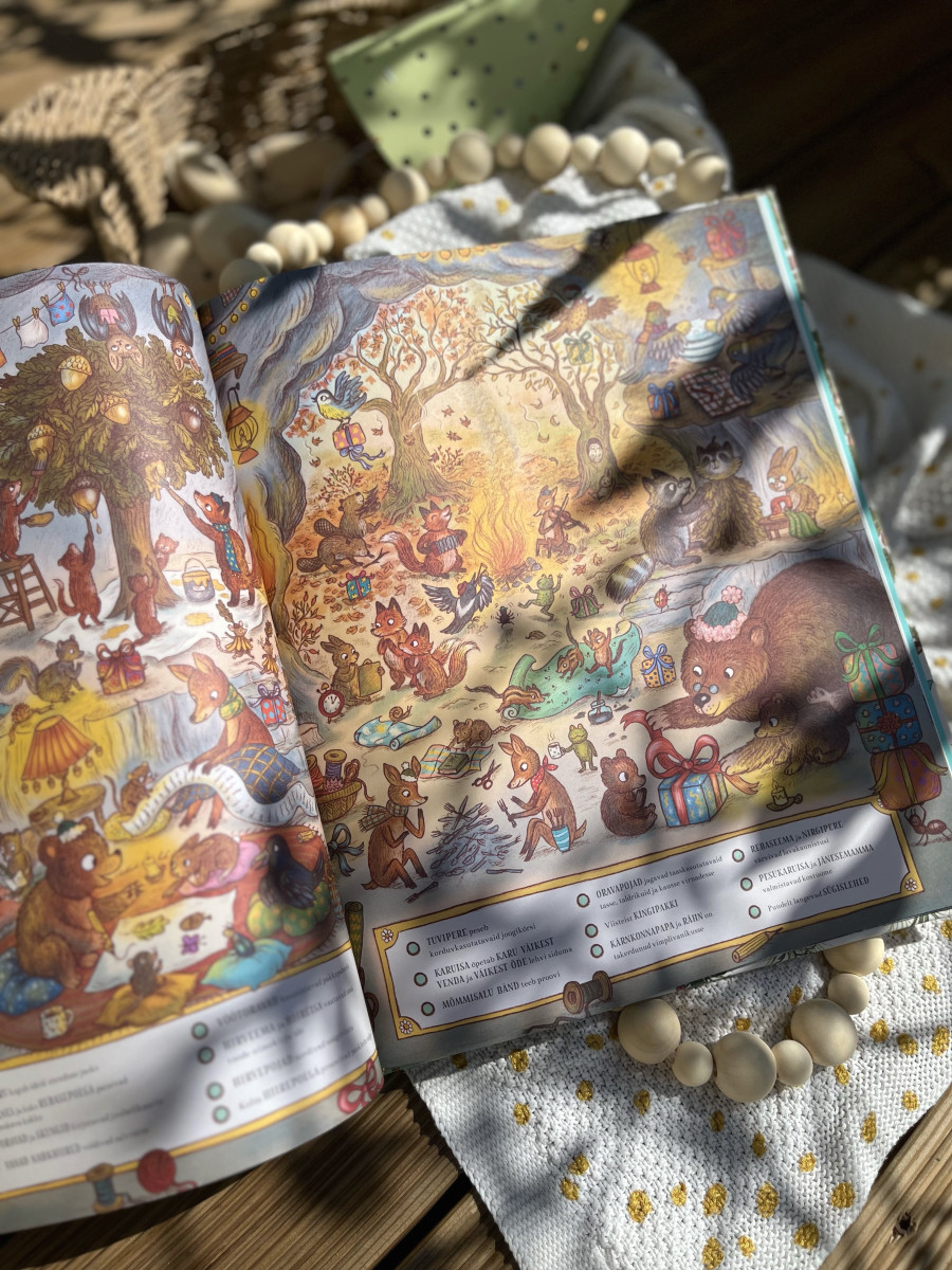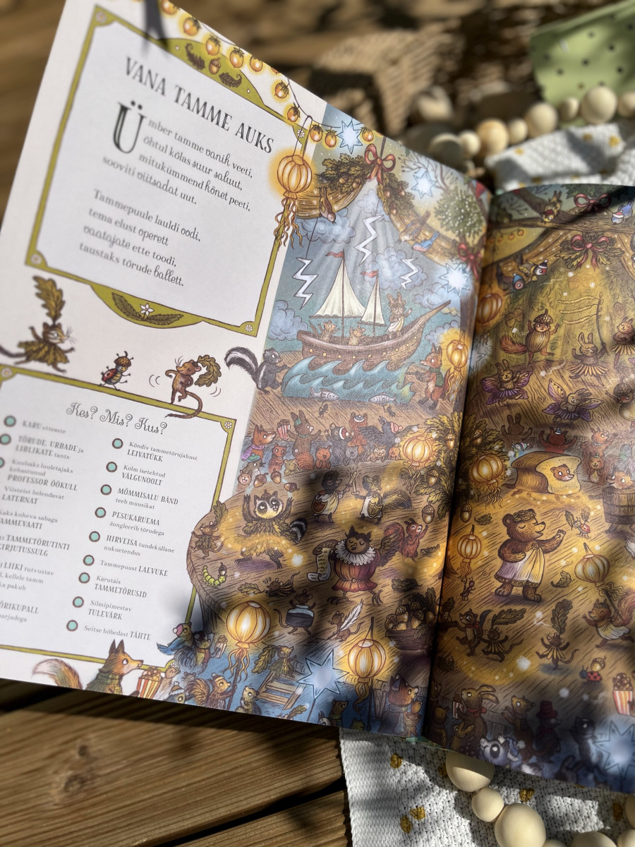 Põnevust jätkub raamatu igale lehepaarile: mis saladusi ja lugusid peidab mets? Suurelt pildilt tuleb lapsel üles leida rubriigis „Kes? Mis? Kus?“ nimetatud detail või väike stseen, milles osaleb keegi metsarahva seast. Iga pildi juures on luuletus, mis kirjeldab juubelisündmusi, alates ideest ja plaanidest kuni peo ja isegi koristuseni. Raamat on üles ehitatud aastaringile, iga aastaaja kohta on kaks-kolm lehepaari. Peale selle jagab raamatu lõpus huvitavat infot „Loodusrada“ ja antakse peokorraldamise näpunäiteid.