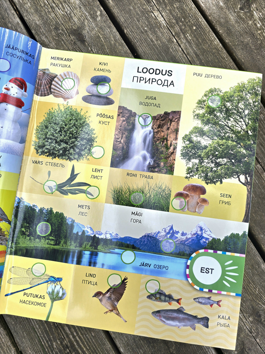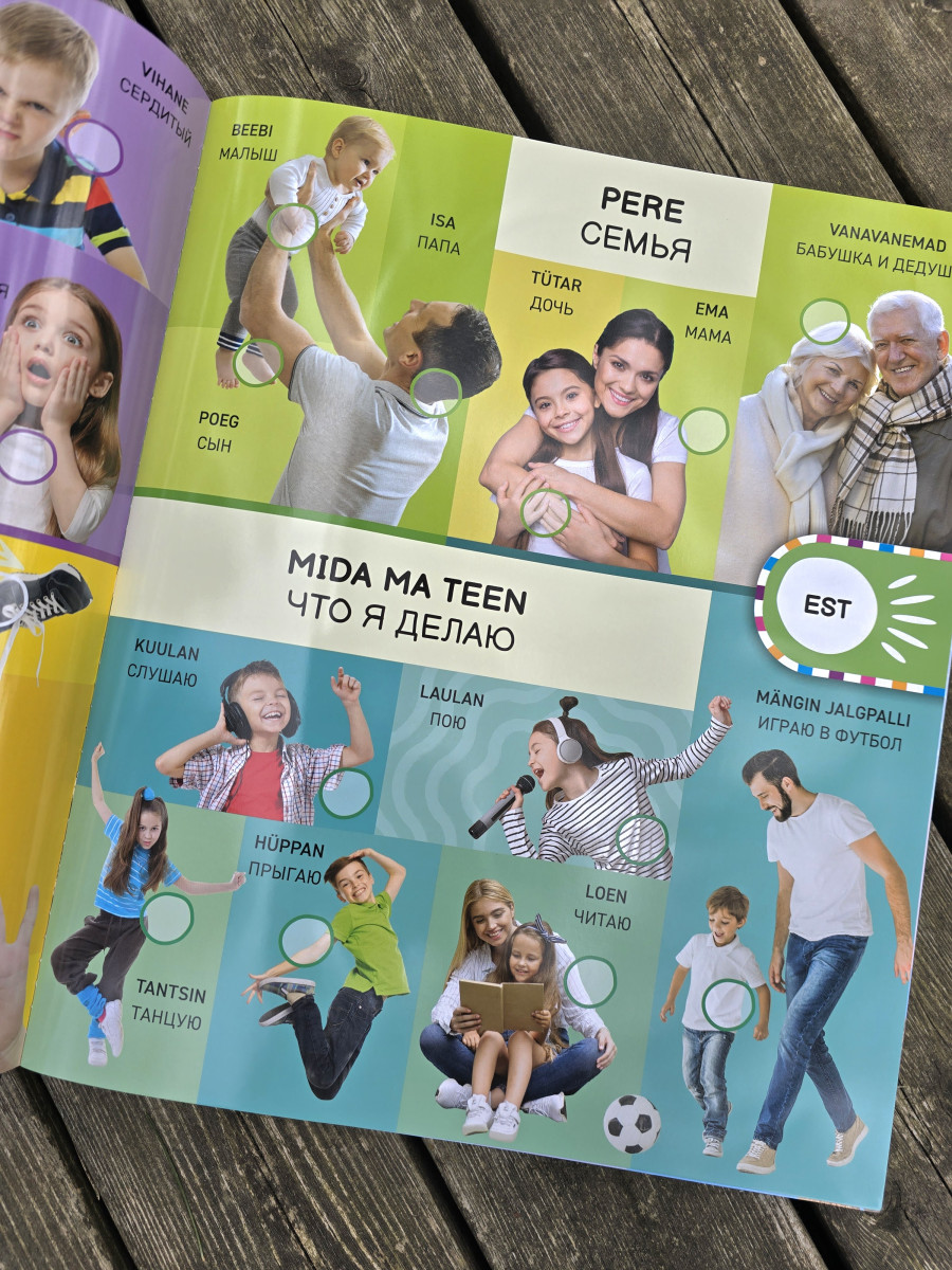 Vahva pilt- ja helisõnastiku abil on uue keele õppimine lõbus ja lihtne. Sõnad ja pildid on esitatud teemade kaupa. Loe ja kuula nii eesti kui ka vene keeles, mis asjad on kodus ja linnas, kes elab talus või metsas ning kuidas nimetatakse kehaosi ja tundeid.