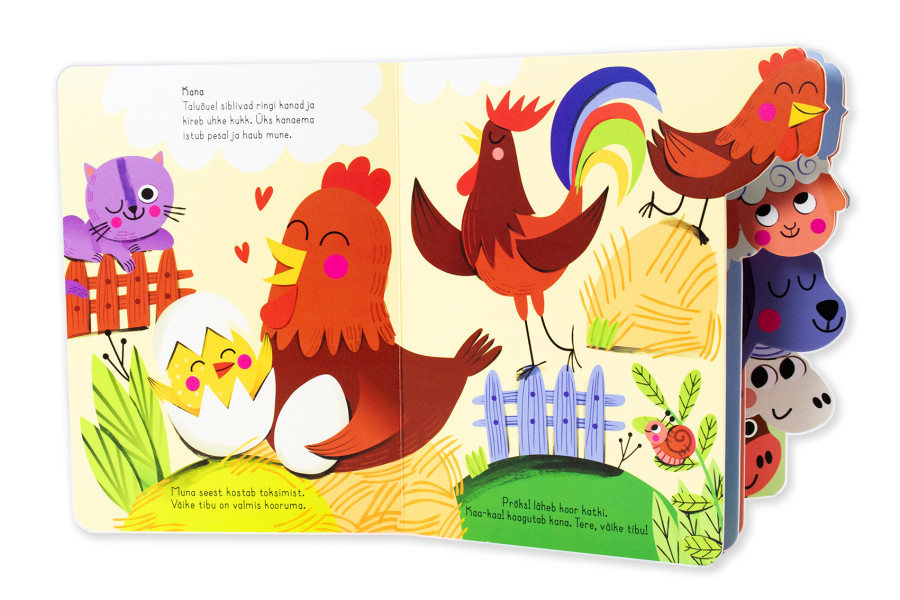 Vaata, kes piiluvad välja selle papiraamatu lehekülgedelt. Laps saab uurida pilte toredatest taluloomadest ning kuuleb, kes nad on ja mis elu nad talus elavad.