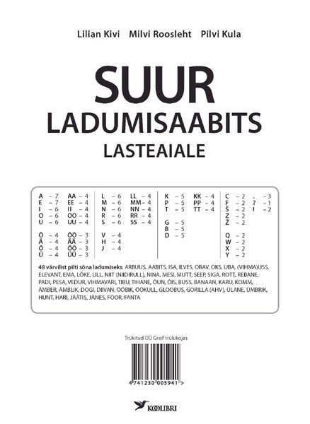Suur ladumisaabits lasteaiale koosneb kahest osast: 1) 48 eseme või tegevuse pilti, mille järgi saab öelda ja (meeles pidada) ühe sõna, koostada selle sõnaga lause jms; 2) värvilised (punased, sinised ja rohelised) ühe ja kahe tähe kaardid. Pildid on valitud selliselt, et nende toel oleks võimalik vaadelda-analüüsida kõiki olulisi sõnatüüpe. Need toetavad ka P. Kula töövihikut „Valmistume kooliks”.