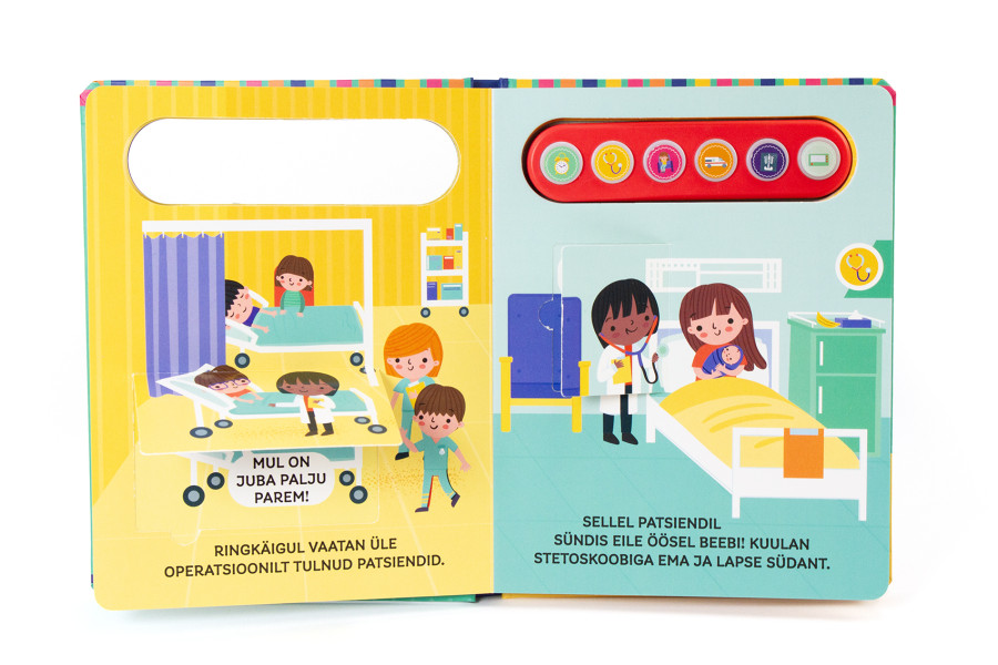 Vahvas helidega klapiraamatus saad teada, milline on arsti tööpäev. Loe, kuidas arst teeb hommikust ringkäiku ja vaatab üle patsiendid. Vajuta 6 helinuppu ja kuula põnevaid hääli.