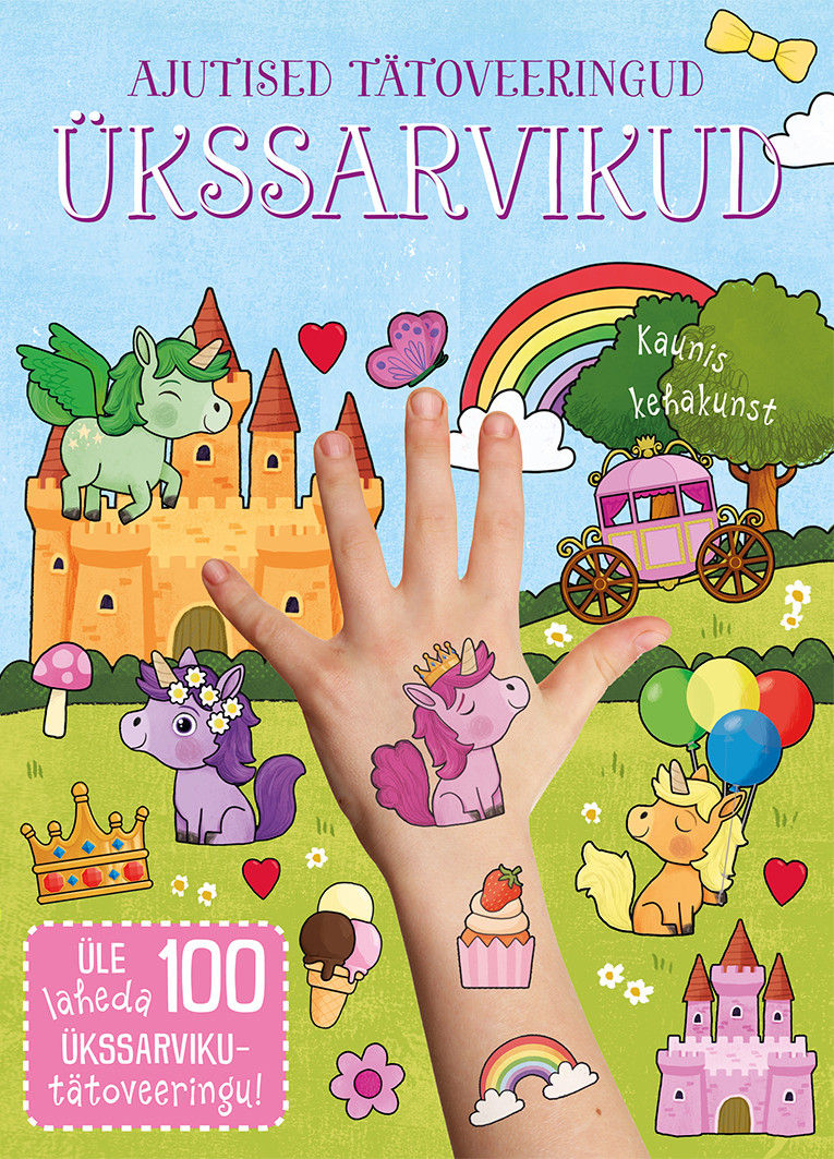 Vahvast vihikust leiad lahedad ükssarvikutega tätoveeringud. Saad nendega kaunistada keha, aga võid neid kleepida ka õnnitluskaardile, tassile, pühademunadele või koostada neist võluloomade albumi. Proovi ka ükssarvikuid joonistada, tee läbi labürint ning vasta pärast ükssarvikute võlujõu ja olemuse uurimist viktoriiniküsimustele.