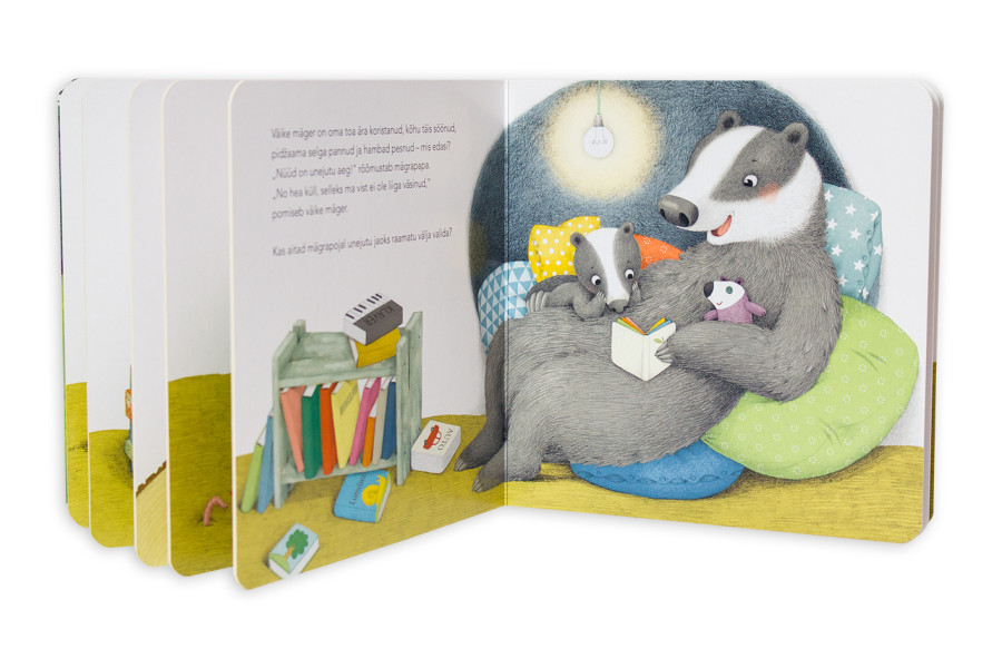 Aga vaevalt on isa unejutu lugemise lõpetanud ja mägrapojale teki peale pannud, kui väike mäger üles hüppab, et jälle mängima hakata. Uni ei tule! Ta pole ju üldse väsinud!